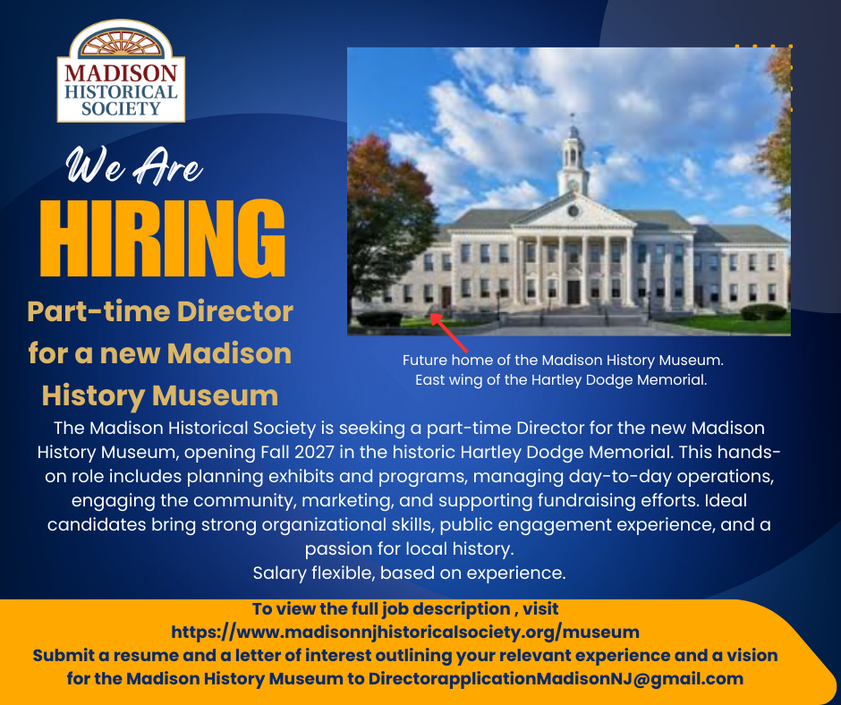 Founded in 1922, the Madison, NJ Historical Society is dedicated to collecting, preserving and sharing Madison’s rich history. Thank you for your interest in sharing this journey with us.